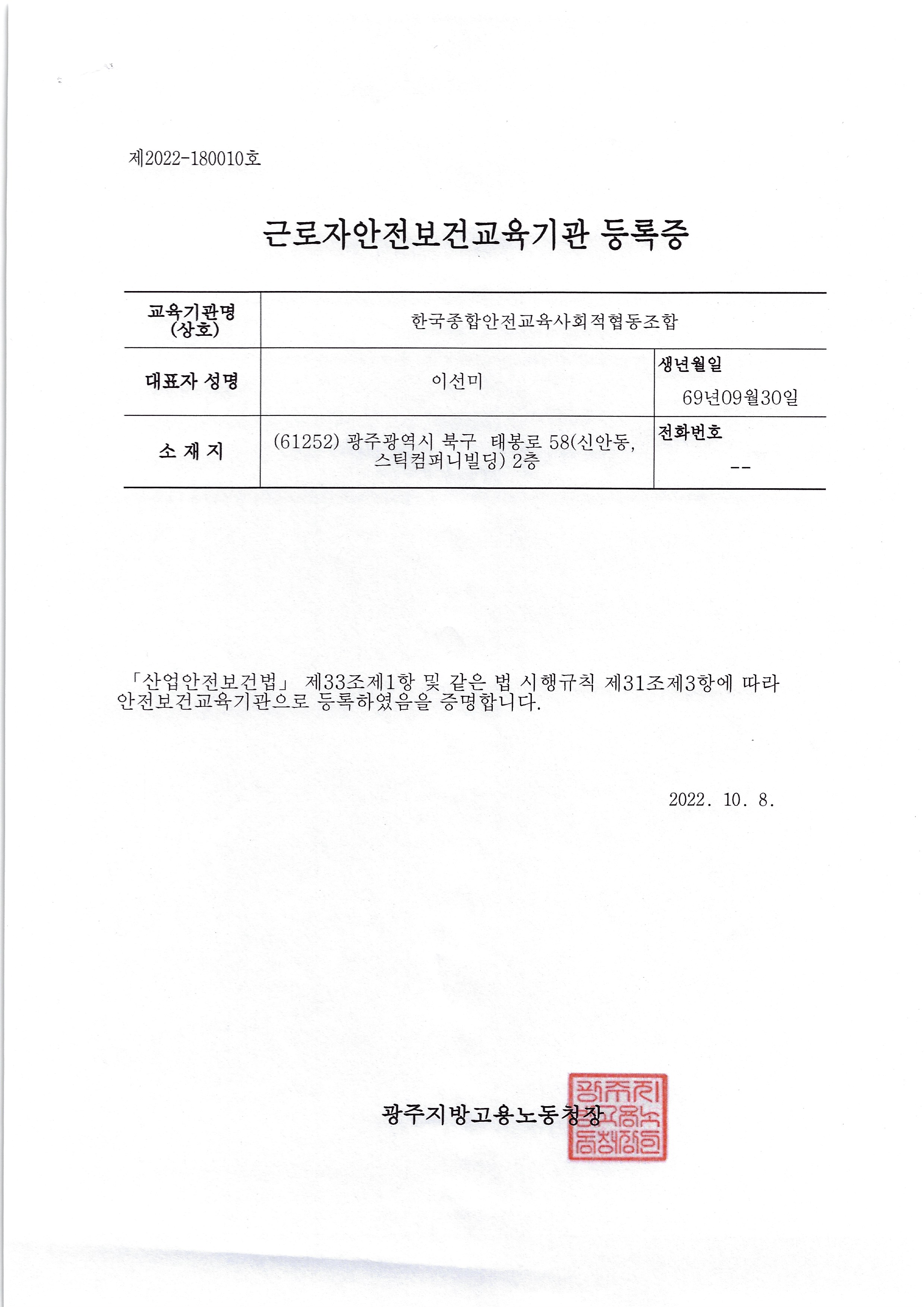 우리 조합은 산업안전보건법 제29조의 「근로자에 대한 안전보건교육」(제2022-180010호)과
